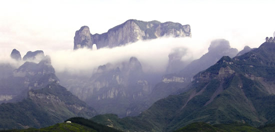 六十八平方公里的山體綿延,卻只有兩平方公里的山頂突起,遠(yuǎn)看如畫屏護(hù)城,近看為“仙”字鼎立,靜黑的石壁,懸崖上散碎的樹(shù)叢,典型的喀斯特地貌讓天門山猶如一副天成的水墨畫。加上獨(dú)特的地勢(shì),一年里幾乎三分之二的時(shí)間,天門山都是云氣飄蕩,這就更為這副巨大的山水畫增添了幾分空靈的韻味。