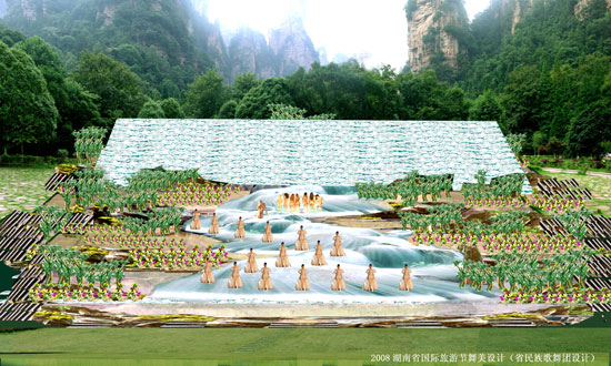 (本網(wǎng)訊)7月28日,經(jīng)過近一個(gè)月的設(shè)計(jì)創(chuàng)作,湖南省民族歌舞團(tuán)舞美設(shè)計(jì)師舒千龍完成2008中國湖南國際旅游節(jié)大型實(shí)景演出“擺手舞天下”舞臺(tái)、舞美設(shè)計(jì),并制作出多角度效果圖。2008中國湖南國際旅游節(jié)總導(dǎo)演陳偉康及本屆旅游節(jié)開幕式場地組組長姜陽春等專家反復(fù)進(jìn)行了論證,在與2008中國湖南國際旅游節(jié)執(zhí)委會(huì)的確認(rèn),最終方陣與舞臺(tái)整體設(shè)計(jì)方案塵埃落定。