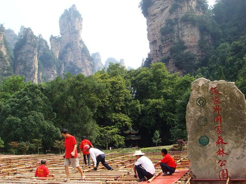 2008中國(guó)湖南國(guó)際旅游節(jié)開幕式舞臺(tái)位于世界自然遺產(chǎn)張家界國(guó)家森林公園老磨灣,根據(jù)導(dǎo)演組的舞臺(tái)美術(shù)設(shè)計(jì),分為主體演出舞臺(tái)和方陣舞臺(tái),總面積1600多平方米,總共將容納1600人同臺(tái)演出。其中主體舞臺(tái)長(zhǎng)40米、深度為31.5米、高1.5米,方陣舞臺(tái)為42米長(zhǎng)、深度9.5米、最高達(dá)10.5米的弧型階梯式舞臺(tái)。整個(gè)工程共需要使用25噸左右的鋼管,舞臺(tái)表面每平方米能夠承重600公斤以上。