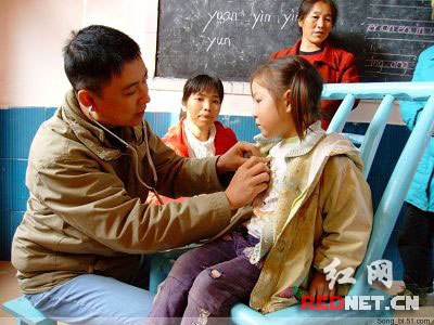 (愛心醫(yī)生網(wǎng)友“逮點叭水”在為孩子們免費檢查身體)