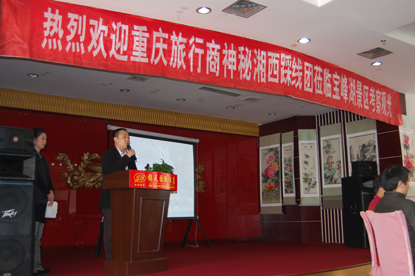 2009年3月29日,來(lái)自重慶的旅游商會(huì)、江北區(qū)旅游局及13家旅行社等100人考察商在走訪了神秘湘西之后抵達(dá)人間仙境張家界,來(lái)到山歌的海洋--寶峰湖。寶峰湖景區(qū)總經(jīng)理童鈞、營(yíng)銷總監(jiān)任建華、張股公司湘西片區(qū)營(yíng)銷總監(jiān)劉英杰全程陪同。 游覽過(guò)程中,考察團(tuán)對(duì)奇峰飛瀑的壯觀、土家山歌的婉轉(zhuǎn)動(dòng)人給予了高度評(píng)價(jià)。泛舟湖上,孔雀開(kāi)屏、半臉八戒、金蟾含月等都令其贊不絕口。游至送客松,當(dāng)導(dǎo)游介紹到寶峰神女的時(shí)候,所有人都發(fā)出感慨:真是世間絕景--其外形亭亭玉立,婀娜多姿,從湖面兩米處往上看,那邊扁平的部分神似一位美女臉部的左側(cè),她目光凝視前方,緊緊抿著的櫻桃小嘴、高高挺起的鼻梁,似乎正在對(duì)這湖水梳妝打扮,二頭上的那部分便是高高盤起的發(fā)髻。 考察結(jié)束后,雙方就對(duì)重慶與張家界兩地的旅游文化進(jìn)行交流,在兩地旅游資源的共享與互補(bǔ)上達(dá)成共識(shí),一致認(rèn)為在以后要緊密合作,攜手打造精品旅游,更好的帶動(dòng)兩地的旅游發(fā)展。