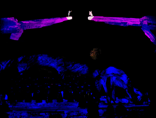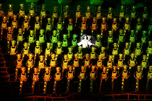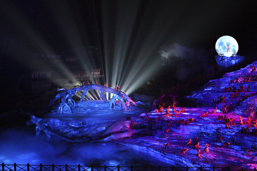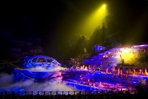 世界第一臺大型山水實景音樂劇《新劉?抽浴吩趶埣医缣扉T山試演。9月13日晚,參加2009湖南國際旅游節(jié)的國內(nèi)外嘉賓、領(lǐng)導(dǎo)和媒體記者近3000人共同見證這一輝煌時刻。
