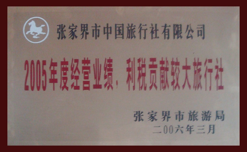6、2006年3月被張家界市旅游局評為《2005年度經(jīng)營業(yè)績,利稅貢獻較大旅行社》