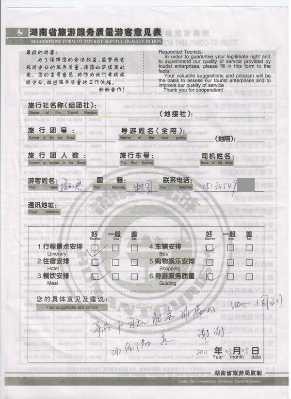 吉林侯麗君一行2人旅游質(zhì)量回饋單