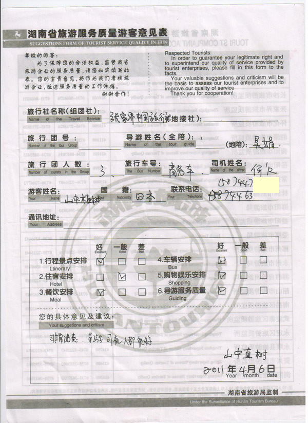 日本山中先生一行3人旅游質(zhì)量回饋:非常滿意,導(dǎo)游司機人都很好!
