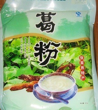 與蕨粉(野生),巖耳一起統(tǒng)稱張家界的三寶,是由一種生長在大山深處的植物葛的根部研磨而成,呈粉末狀。吃的時候先兌少許冷開水,再在鍋中兌水煮沸、攪拌、配白糖,頓呈晶瑩糊壯,嘗之絲滑入喉。因為葛難尋,葛根粉便成為了土家人平日用來招待貴客的小吃,它不僅味獨特鮮美而且有褪火清腸的功效,是純綠色食品的典型代表。