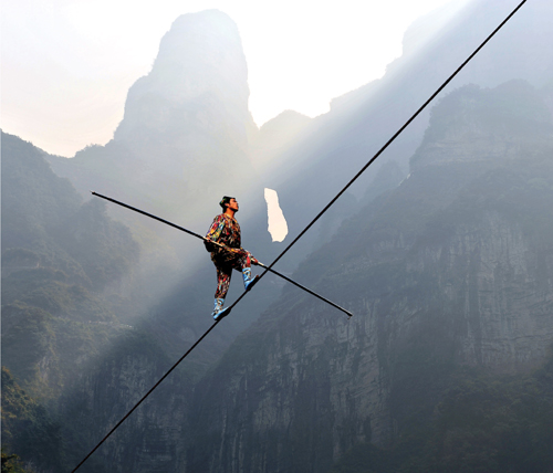 2008年10月,新疆達瓦孜絕技第七代傳人賽買提·艾山在天門山進行了空前難度的極限坡度高空走鋼絲行走挑戰(zhàn)。鋼絲架設在天門山奇峰絕嶺間,長700米,傾斜度達39°。此次挑戰(zhàn)的難度之大超乎想象,被眾人視為不可能完成的任務。賽買提最終功虧一簣,在離終點約60米處跌倒,但其勇氣和絕技令眾人折服。2009年4月,賽買提英雄歸來,再次挑戰(zhàn)這條鋼繩并終于成功,在天門山創(chuàng)造出世界高空鋼絲行走最具難度和風險的一次極限征服。