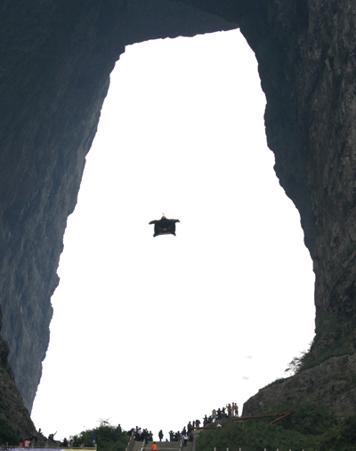 2011年9月24日,“2011翼裝飛行穿越天門”極限挑戰(zhàn)活動在天門山震撼上演。來自美國、意大利、芬蘭等6個國家的9名翼裝飛行高手分別以天門山索道轎廂、山頂懸崖為起跳點,進行了精彩絕倫的翼裝飛行表演。當天,全球最頂尖的“翼裝飛俠”,來自美國的杰布・科里斯還成功挑戰(zhàn)人類首次無動力翼裝飛行穿越天門洞。1999,世界特技飛行大師駕機穿越天門,實現(xiàn)了人類首次駕機穿越自然山洞的奇跡。2011,“穿越天門”挑戰(zhàn)12年后再次呈現(xiàn),舉世震撼!