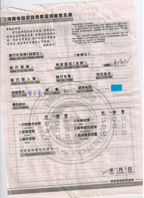臺灣黃先生一行6人旅游質(zhì)量回饋