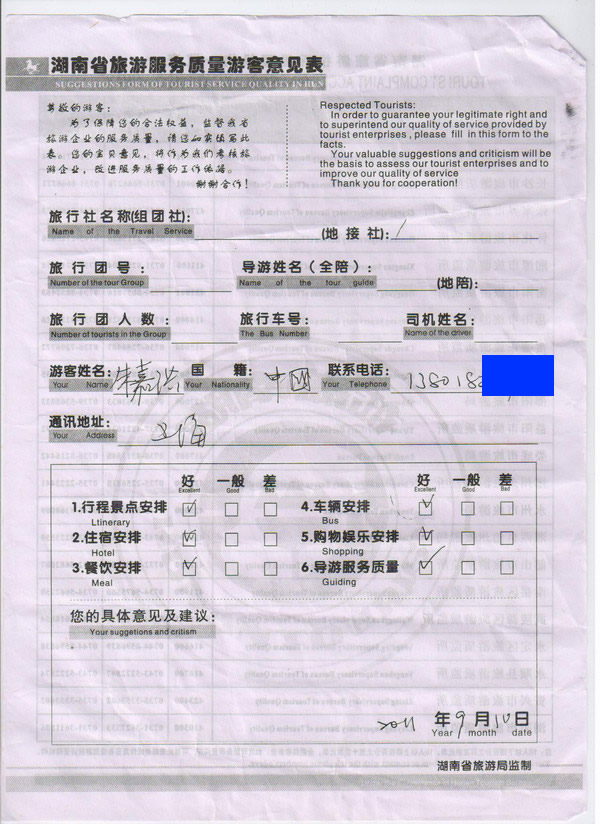 上海朱小姐一行7人旅游質(zhì)量回饋: