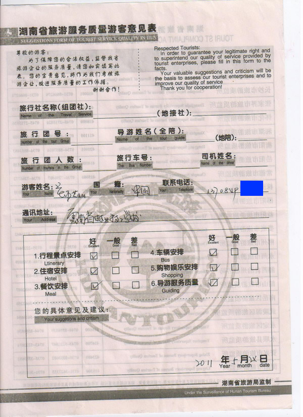云南鄭小姐一行5人旅游質(zhì)量回饋