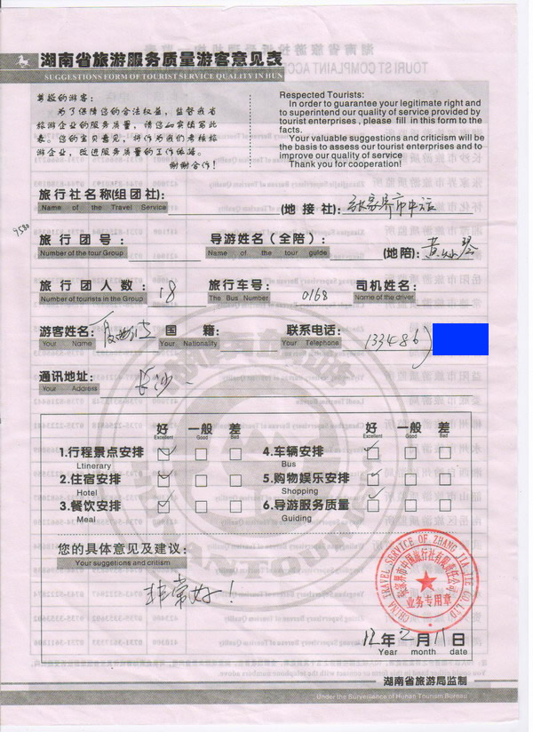 長沙夏先生一行18人旅游質(zhì)量回饋