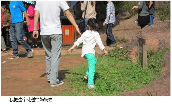 當看到路旁的各種野花時,這位小女孩又突發(fā)奇想:“爸爸,等等我,我給媽媽送朵花!薄安灰S便摘花哦!痹捯粑绰,女兒卻早已將野花摘在手上。等趕到媽媽將花送給媽媽時,媽媽的臉上洋溢著的是滿滿的欣慰與幸福,“來我給你插上。”媽媽將小野花插在了小女孩的頭上。
