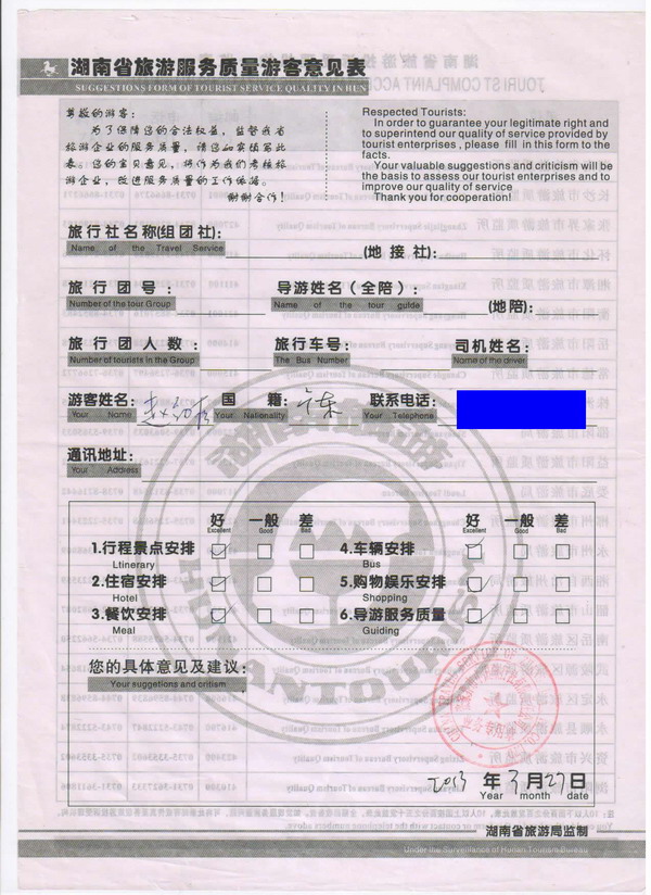 廣東趙先生一行22人旅游質(zhì)量回饋單