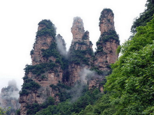聳立著的三座灰白色的石峰,人稱“三姐妹峰”。每座峰高100多米,上小下大,形似三個(gè)穿著花羅裙的苗族少女。她們立在山梁上,亭亭玉立,若有所思,真是神形兼?zhèn)。相傳這是三個(gè)苗姑站在山梁上與情郎對唱情歌,她們情真意切,在這里唱了三天三夜的苗歌。后來天上出現(xiàn)七個(gè)日頭,把大地曬裂口了,把樹木曬枯了,把河水曬干了,把她們?nèi)齻(gè)人哩,燒化為石頭了。