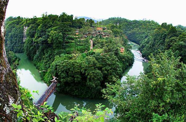 可以抽掉木板,斷掉追兵去路,具有戰(zhàn)略防御的功能。現(xiàn)在是苗族青年男女“趕邊邊場”(唱情歌、談戀愛)的地方。大家順著我手指的方向看,苗王河邊的山腰上的兩個天然的溶洞口象兩只大眼睛,還有長長的鼻子,這就是傳說中的“神象取水”了,F(xiàn)在我們到碼頭去坐游船,在苗王河泛舟,游覽苗王峽谷的山水風(fēng)光。